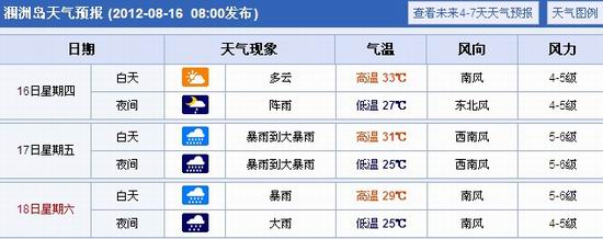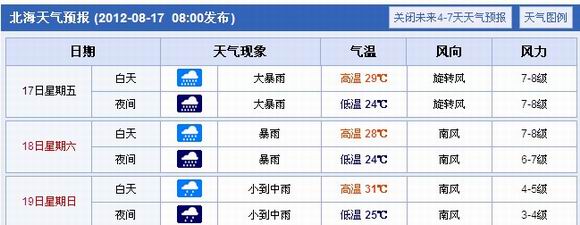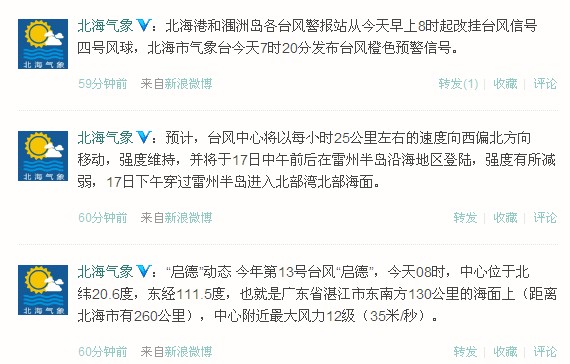 北海氣象局17日,北海市,有暴雨到大暴雨,旋轉風8到9級,陣風10到11級,北部灣海面,有大暴雨,旋轉風10級,陣風12到13級。 18日,北海市,有暴雨,偏南風6級,陣風8級,北部灣海面,有暴雨,偏南風7到8級,陣風9到10級。 19日,北海市,小到中雨,偏南風3到4級,北部灣海面,小到中雨,偏南風5級,陣風6級。