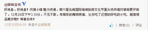 來自北海銀灘宣傳微博12月25日的信息,第六屆北海國際海灘旅游文化節(jié)重頭戲僑港風(fēng)情街將于12月28日下午3.30分開街了,屆時(shí)不僅會(huì)有精彩的舞獅表演,還會(huì)有美味的小吃、越南商品展示。到30日結(jié)束,活動(dòng)歷時(shí)3天!本次活動(dòng)結(jié)束后風(fēng)情街仍正常開業(yè)經(jīng)營。