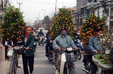 在越南首都河內(nèi)街頭,幾名居民拉著從花市買回的柑桔樹回家。與中國一樣,春節(jié)是越南最隆重的傳統(tǒng)節(jié)日,家家戶戶都會在節(jié)前準備各種年貨。