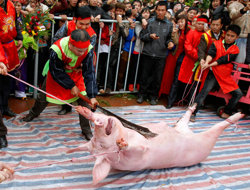 另外,越南不少少數(shù)民族地區(qū)還有不同的慶典儀式,最特別就屬虐殺活豬祭祀了,在越南北寧省Nem Thuong村,當?shù)卮迕裨谡鲁趿@天舉行儀式,紀念13世紀反抗皇權的將軍Doan Thuong,Doan Thuong也被當作該村的守護神。