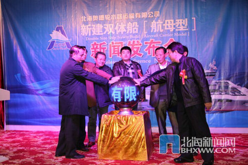 據北海新聞網的消息,2013年1月8日,北海奧德倫水路運輸有限公司召開的“新建雙體船【航母型】新聞發(fā)布會”上獲悉,北海奧德倫水路運輸有限公司將委托青島歐世達船舶工程有限公司建造一艘46米的雙體型航母客船,用于北海海上觀光旅游項目。