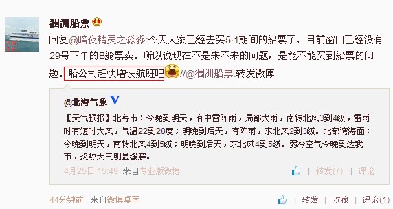 此外,有不少游客反映目前在各個(gè)售票窗口已經(jīng)排上了長(zhǎng)隊(duì),還有網(wǎng)友直接在網(wǎng)上反映無法買到29日的B倉船票了,呼吁船務(wù)公司繼續(xù)增開航班。北海旅游網(wǎng)也在這里提醒準(zhǔn)備出門游玩的朋友,千萬不要將時(shí)間掐得很死,及時(shí)調(diào)整行程以免耽誤了自己的航班哦!