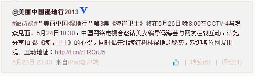 5月10日,2013年《美麗中國(guó)·濕地行》大型公益活動(dòng)在北京啟動(dòng),中央電視臺(tái)臺(tái)長(zhǎng)胡占凡、國(guó)家林業(yè)局局長(zhǎng)趙樹叢及活動(dòng)形象大使宋祖英等出席。央視派出團(tuán)隊(duì)分赴全國(guó)重要濕地,進(jìn)行為期半年的拍攝,將制作播出50集大型系列片《走遍中國(guó)·濕地行》,從中評(píng)選出最美的十大濕地,制作10集紀(jì)錄片《魅力濕地》,并將于今年10月份舉行大型晚會(huì),公布十大魅力濕地名單。