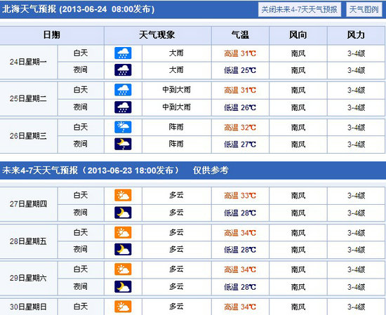 未來兩天我市受風暴環(huán)流和西南季風共同影響,北海市,有大雨,局部暴雨,南風4到5級,氣溫26到31度,25日,大雨,偏南風3到4級。北部灣海面,偏南風6級陣風8級,明天起,偏南風5到6級。北海潿洲島航線今天已經恢復,游客朋友游玩時記得帶好雨具。