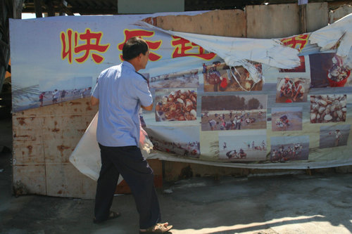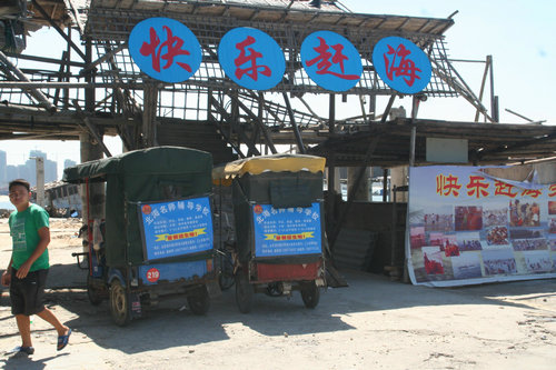 為了解決這個(gè)危及游客生命的頑疾,7月1日上午,北海市旅游整規(guī)辦組織旅游、工商、公安、海事等執(zhí)法部門,以迅雷不及掩耳之勢,搗毀了位于大礅海和金海灣紅樹林附近的以“歡樂趕!睘槊3個(gè)非法“趕!备C點(diǎn),并現(xiàn)場拆除了“趕!闭信坪托麄鲌D畫一批。