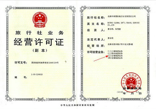 解讀:邊境旅游業(yè)務屬特殊旅游業(yè)務,需另行申請。如“北海至越南下龍海上5日游邊境旅游業(yè)務”就需在出境旅游業(yè)務的基礎上另行申請。申請成功后,增存質量保證金10萬元人民幣,然后“到國家旅游局換發(fā)《國際旅行社業(yè)務經(jīng)營許可證》、到工商行政管理部門辦理經(jīng)營范圍變更登記手續(xù)、到公安部門和相關口岸邊防檢查站辦理備安手續(xù)”。辦理完成后,經(jīng)營范圍中便會增加“邊境旅游業(yè)務”項目。