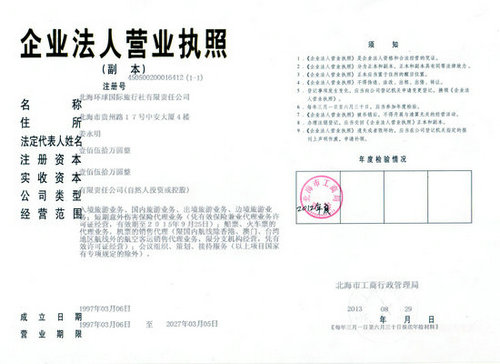 北海環(huán)球國際旅行社有限責任公司是經(jīng)國家旅游局批準成立的具有出境游資格的一類國際旅行社,已足額交納旅游質量保證金170萬元,主營:入境旅游業(yè)務、出境旅游業(yè)務、邊境旅游業(yè)務、國內旅游業(yè)務四大旅游業(yè)務,是北海目前規(guī)模最大、綜合實力最強的國際旅行社之一(國際旅行社經(jīng)營許可證號:L-GX-CJ00037)。