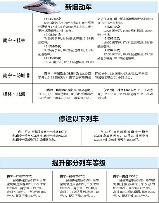 當(dāng)代生活報訊 昨日,記者從南寧火車站獲悉,火車站從12月28日零時起調(diào)整列車運行圖,新增開了動車,并停運部分列車和增加或取消部分車站,還有部分普通快速旅客列車升級為空調(diào)快速旅客列車。
