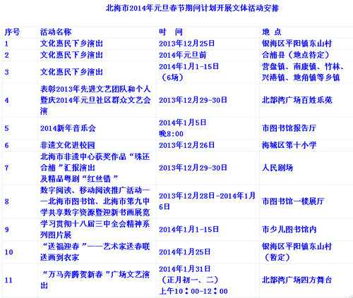 近日,北海政府網(wǎng)發(fā)布了《北海市2014年元旦春節(jié)文體活動安排表》,北海市文化部門在2014年元旦春節(jié)期間,開展很多形式多樣、內(nèi)容豐富多彩的文體活動,有興趣的游客朋友不妨去看看哦~