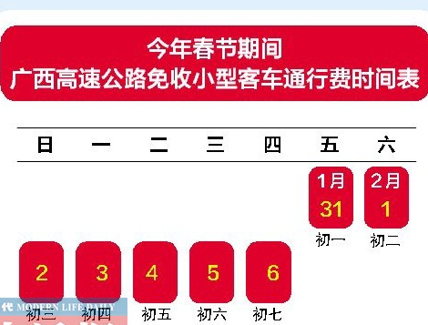 今年春節(jié)放假時間為1月31日至2月6日,即大年初一至初七,如果按照交通部的文件精神執(zhí)行,廣西高速公路今年春節(jié)期間免費通行的時間是1月31日00:00時起,至2月6日24:00時結(jié)束,也就是年初一至初七可免費通行,除夕當天廣西高速公路不免費通行。