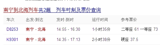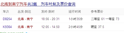 北海到南寧列車時(shí)刻