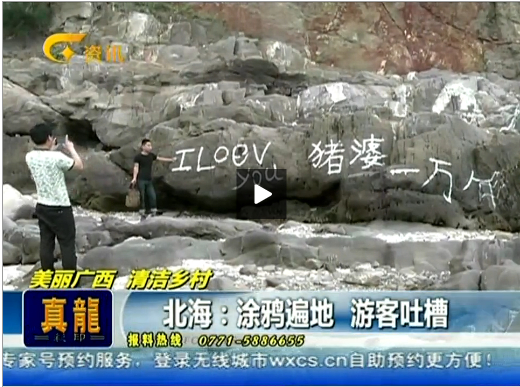 (北海旅行社訊)據(jù)廣西電視臺(tái)新聞在線欄目披露,北海清明節(jié)前后迎來了周邊不少游客光臨,但是同時(shí)大家也發(fā)現(xiàn)了一些讓人痛心的情況。北海美麗的南萬海岸不少天然大礁石上被人為的刻畫、涂鴉,而且大多數(shù)印記難以清潔恢復(fù)。
