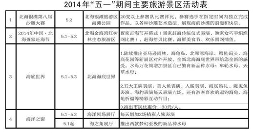 (北海旅行社訊)馬上就“五一”了,各位游客朋友是不是已經(jīng)開始打理行囊了呢?為了方便大家更加合理安排行程,北海旅行社為大家整理匯總了一下五一期間北海各大旅游景區(qū)的活動安排: