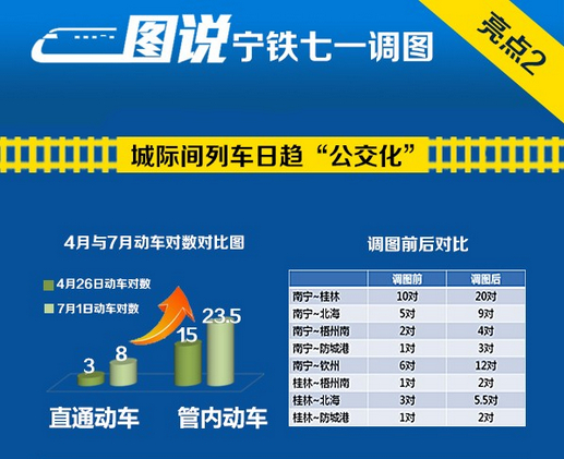本次列車運(yùn)行調(diào)整,南寧鐵路局重新鋪畫了區(qū)內(nèi)的動(dòng)車運(yùn)行方案,將現(xiàn)行16節(jié)編組的動(dòng)車解編為8節(jié)編組運(yùn)行,在運(yùn)能變化不大的情況實(shí)現(xiàn)了動(dòng)車開行密度更大、頻次更高,動(dòng)車開點(diǎn)和到點(diǎn)更合理、更便民,努力實(shí)現(xiàn)人們“隨到隨買、隨買隨走”的出行愿望。調(diào)整后,區(qū)內(nèi)動(dòng)車開行對(duì)數(shù)將達(dá)到23.5對(duì),即每天開行47趟,待全部區(qū)內(nèi)及跨省動(dòng)車開行后,廣西區(qū)內(nèi)主要城市間的將呈現(xiàn)動(dòng)車開行“公交化”。
