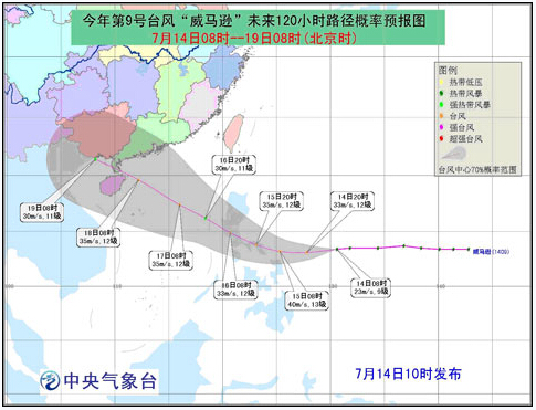 預(yù)計(jì),“威馬遜”將以每小時25公里左右的速度繼續(xù)向偏西方向移動,強(qiáng)度逐漸加強(qiáng),最強(qiáng)可達(dá)臺風(fēng)級(12-13級,35-40米/秒)。“威馬遜”有可能于16日凌晨登陸菲律賓呂宋島東部沿海,16日下午至夜間進(jìn)入南海東部海面。14-15日,“威馬遜”對我國海域無影響。