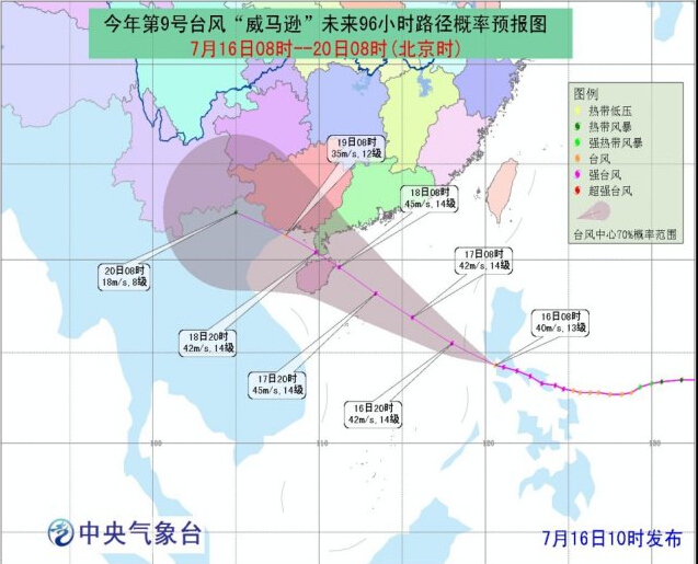 預計,“威馬遜”將以每小時25公里左右的速度向西偏北方向移動,逐漸向海南東部到廣東西部一帶沿?拷瑥姸冗將再次加強,并將于18日凌晨到中午在海南陵水到廣東陽江一帶沿海登陸,預計登陸強度可達14-15級(42-48米/秒)。