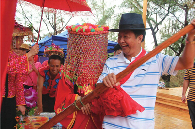 7月26日,疍家風(fēng)情實(shí)景表演彩排,記者觀賞了一場(chǎng)精彩的富于北海民族特色的疍家文化文藝演出。在疍家迎賓禮節(jié)展示環(huán)節(jié),疍家姑娘、小伙們身著疍家禮服,在入場(chǎng)口齊唱咸水歌迎賓曲,歡迎嘉賓的到來(lái);開場(chǎng)舞蹈《疍家漁民在海邊》表現(xiàn)了勤勞善良的疍家姑娘和小伙子男捕女織,快樂(lè)充實(shí)的生活場(chǎng)景,舞蹈中,疍家日常生活和勞作習(xí)俗的畫面構(gòu)成了一幅美麗的畫卷;舞蹈《疍家女民兵》講述了疍家女子不愛紅裝愛武裝,巡邏、操練,抵御各種襲擾,保護(hù)漁民生命財(cái)產(chǎn)安全的英勇事跡;實(shí)景模擬秀《疍家婚禮》,是整場(chǎng)活動(dòng)的高潮;槎Y使用了全套疍家婚嫁道具,現(xiàn)場(chǎng)布置了男方家、女方家、接親道路和禮堂,游客參與互動(dòng),扮演新郎新娘、伴郎伴娘、親朋好友、圍觀群眾等角色,共同完成下聘禮、哭嫁、接親、顛船、拜堂行禮等婚俗禮節(jié),讓游客親身體驗(yàn)疍家婚禮風(fēng)俗。
