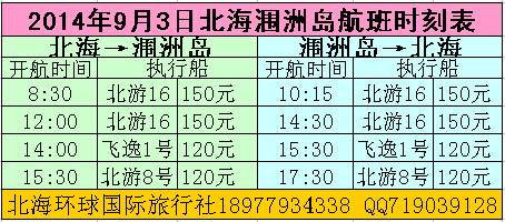 2014年9月3日北海潿洲島航班時(shí)刻表: