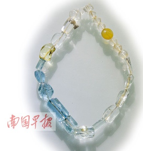 “三色水晶串珠”于1990年在合浦黃泥崗漢墓出土,串珠上有4顆漂亮的淺藍色晶體,琢成圓柱形,最小的一顆也有花生米大!爱敃r的文物與考古學家都認為這種淺藍色相當少見”,合浦漢代文化博物館館長廉世明說,這幾粒晶體最后被鑒定為“罕見的淺藍色水晶”。