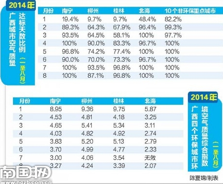 9月12日,自治區(qū)環(huán)保廳發(fā)布2014年8月城市環(huán)境空氣質(zhì)量狀況月報(bào)。按照城市環(huán)境空氣質(zhì)量綜合指數(shù)評(píng)價(jià),廣西4個(gè)環(huán)保重點(diǎn)城市中,北海最佳,柳州空氣質(zhì)量最差。