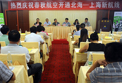 據(jù)報(bào)道,24日上午,春秋航空開(kāi)通北海至上海新航線通氣會(huì)在北海中玉大酒店順利召開(kāi),北海市旅游局副局長(zhǎng)李軍、市場(chǎng)科科長(zhǎng)林小玲、北海機(jī)場(chǎng)管理公司總經(jīng)理周衛(wèi)東等出席了此次會(huì)議。