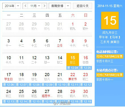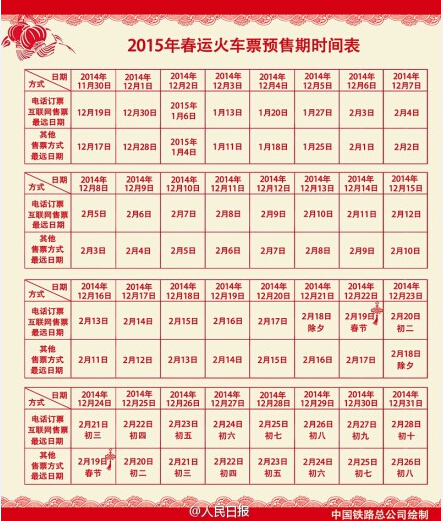 據(jù)中國之聲《全國新聞聯(lián)播》報道,中國鐵路總公司今天發(fā)布:從12月1號起,鐵路互聯(lián)網售票、電話訂票的預售期將由目前的20天逐步延長至60天。12月7號起,將開始發(fā)售2015年鐵路春運火車票。車站窗口等其他售票方式仍按錯后兩天的原則執(zhí)行。