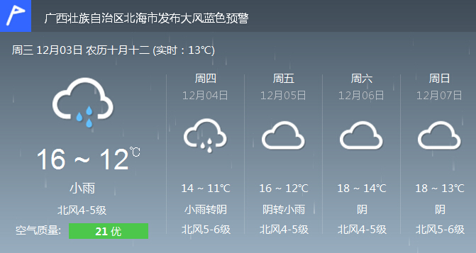 受強(qiáng)冷空氣影響,北部灣海面:今天,陰天有小雨,偏北風(fēng)5~6級(jí),陣風(fēng)7級(jí);4日,陰天有小雨,偏北風(fēng)6~7級(jí),陣風(fēng)8到9級(jí)。北海港和潿洲島各臺(tái)風(fēng)警報(bào)站所掛強(qiáng)風(fēng)信號(hào)一號(hào)風(fēng)球不改變。由于海面風(fēng)浪減弱,今天潿洲島航班開通一班往返潿洲島的航班,滯留島上的朋友可以考慮選擇回市區(qū),而計(jì)劃上島的游客朋友還需要謹(jǐn)慎。