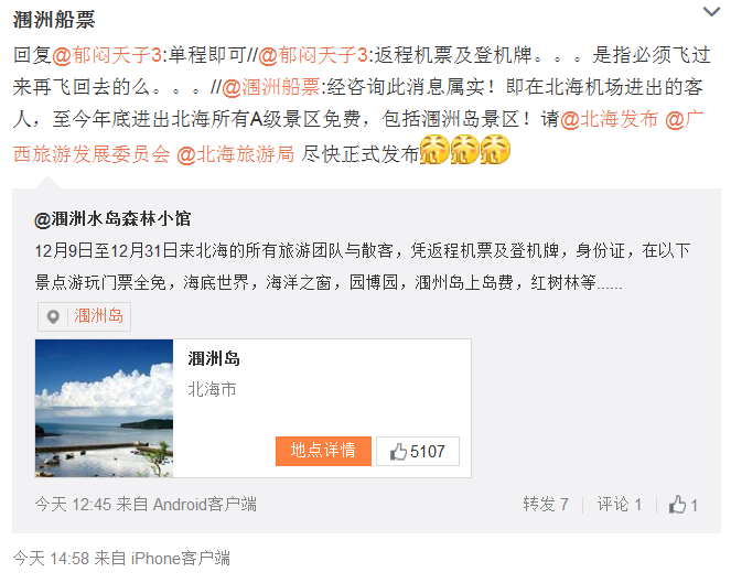 來(lái)自旅游業(yè)內(nèi)人士的消息,近日,北海市旅游局做出決定。從12月9日至12月31日,凡在北海機(jī)場(chǎng)進(jìn)出的所有旅客,憑登機(jī)牌或出票憑證及身份證明,均可免費(fèi)游覽北海所有A級(jí)收費(fèi)景區(qū)。海底世界,海洋之窗,園博園,潿州島上島費(fèi),紅樹(shù)林等。目前相關(guān)單位還沒(méi)有發(fā)布正式通告,不過(guò)可信度非常高,北海旅游網(wǎng)會(huì)跟蹤報(bào)道。