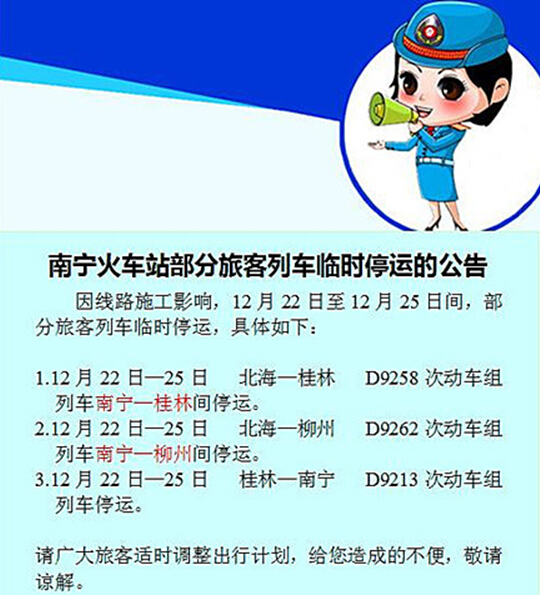 來自南寧火車站的通知:因線路施工影響,12月22日至12月25日間,南寧火車站部分動車組列車臨時停運,請旅客朋友及時調(diào)整出行。