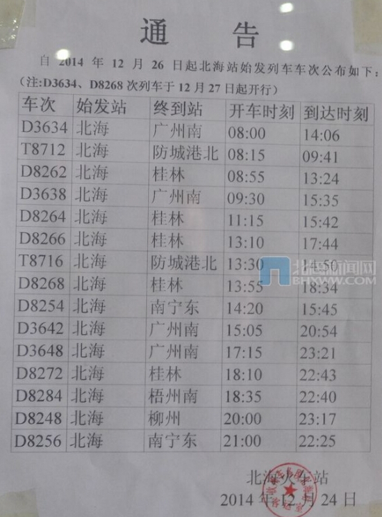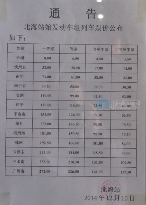 從北海火車站了解到,12月26日北!獜V州南的動車,當天有3趟,26日以后每天4趟。如下是動車時刻表和票價。