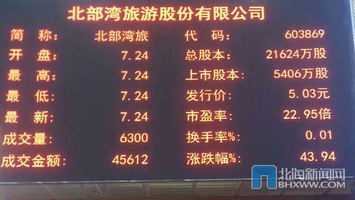 記者現(xiàn)場(chǎng)看到,鑼聲響過之后,上證所證券大廳的電子屏顯示,股票代碼603869、發(fā)行價(jià)5.03 元的“北部灣旅”股票開盤價(jià)為7.24元,漲幅43.94%,直接漲停。
