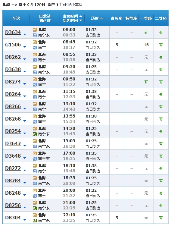北海到南寧動(dòng)車時(shí)刻表