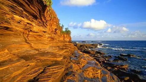 海未枯,石已碎。在芝麻灘,我見到了顏色和大小像極黑芝麻的火山碎粒。它們布滿山崖,和其他砂粒擠在一起,上面還趴著很多綠色小蝸牛,整個(gè)就像一塊長長的芝麻綠豆糕。“糕點(diǎn)”上層是綠色植被,有些地方,幾條長長的翠生生的藤蔓婆娑下墜! ∶娉蠛,夾在藤蔓之間,背景是千年古崖,在海濤聲中,“咔嚓”一聲,留個(gè)倩影,定格在永恒時(shí)間的某一瞬,別提是一件多美的事了!海水退潮之后,還可以在層層疊疊的火山熔巖上漫步、玩耍、留影! ∵@些熔巖身上含有多種金屬元素,再加上低洼處的積水和海浪沖擊飛濺的浪花,在陽光照耀下,五光十色,美不勝收。因此,芝麻灘也叫五彩灘。