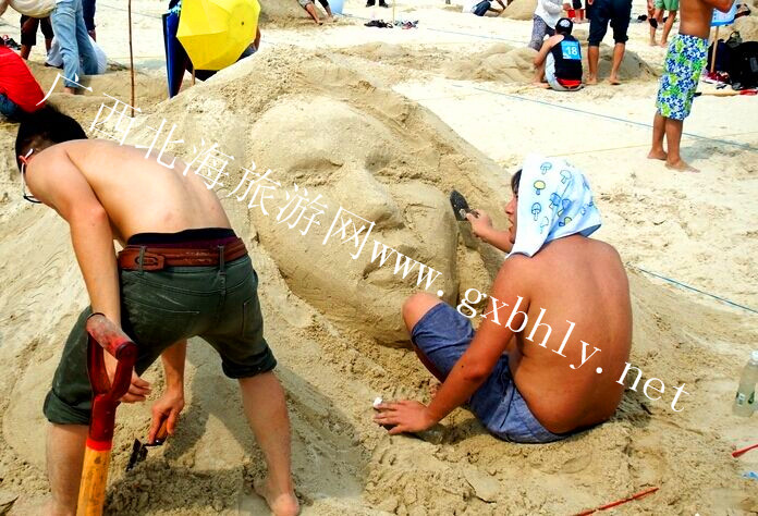 每年五一節(jié),銀灘都會舉辦沙雕大賽,今年已經(jīng)是第九屆了。今天上午,來自北海、欽州、南寧等城市的數(shù)百位選手又在銀灘公園開始了一場沙雕大賽,他們要在兩個半小時內(nèi)用沙子做出自己滿意的作品。今天上午太陽很大,選手們曬了一上午也是挺辛苦的。
