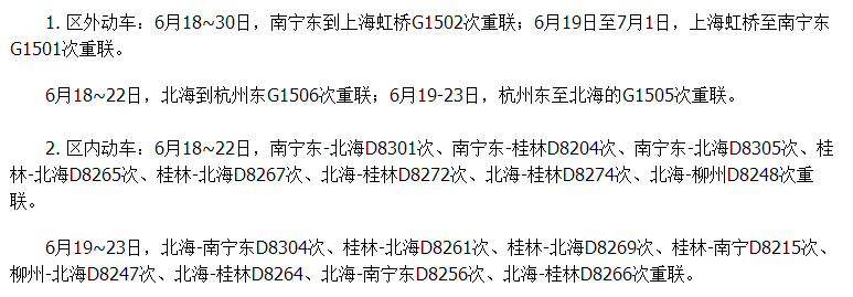 端午節(jié)(6月19-22日)南寧鐵路局將在北海方向增開多趟動(dòng)車、現(xiàn)有部分動(dòng)車重聯(lián),具體如下