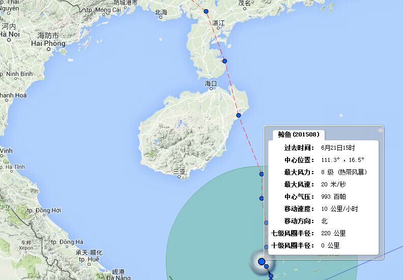 今年第8號臺風(fēng)“鯨魚”于今天(21日)上午11點(diǎn)鐘在南海中部海面上生成。逐漸向海南東部至廣東西部沿?拷,并將于22日夜間到23日白天在海南東部至廣東西部沿海登陸,預(yù)計登陸時強(qiáng)度為熱帶風(fēng)暴級(中心最大風(fēng)力8~9級)臺風(fēng)將帶來較強(qiáng)降雨。