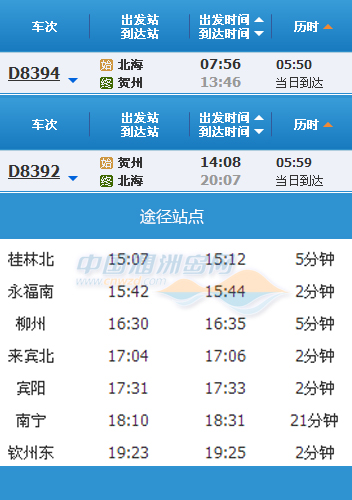 從今日起,在北海賀州兩地間,由臨時增開賀州至北海的單向運行動車,改為每天一對北海至賀州的往返動車。、早于今年7月28日,首趟從賀州開往北海的直達(dá)動車D9644正式發(fā)車,此消息一出,立即吸引不少眼球。而對于想前往北海度假旅游的賀州市民來說,有喜有憂。由于賀州至北海是臨時增開的單向運行動車,當(dāng)旅游結(jié)束想要搭乘動車返回賀州的旅客需要在南寧轉(zhuǎn)車才能到家。而隨著9月9日開通雙向往返動車,這個問題將得以解決。