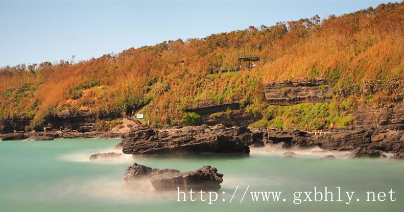 下午是火山公園的時間,潿洲島不愧是火山島,這里滿是火山后的痕跡。巖層一層一層的堆積起來,溝溝壑壑的疊起來,奇形怪狀的,不得不感嘆大自然的鬼斧神工。公園里的石頭,每塊都不滿細細的小孔,奇特的是在這樣的絕壁上,數(shù)目草叢綿延,反而在這里我看到了秋天的痕跡。巖石上,滿是金黃的一片,但不顯衰敗,反而空前的熱烈與明朗;石壁的上層件裂隙中有水溢出,一點一點往下滴,如珠簾垂掛,美麗極了。更有趣的是,可以在這么美麗的海灘上,撿到自己心儀的貝殼,小巧精致,真真的成了我的心頭摯愛。就今天我還成為“美人魚”,在展覽的海水中遨游了一把,看著成群的小魚在自己身邊游來游去,還不時的舔抵我身上,隔著潛水服那種觸感不是很真切,但是看著這一景象心里就一片綿密的快樂。