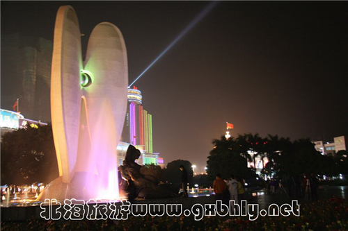 北部灣廣場川流不息的人群和車輛,那顆明珠和噴泉尤為出眾。