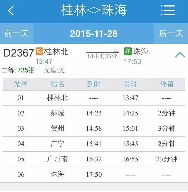桂林北—珠海動車車次編號為D2367/8次,使用CRH2A型動車,經(jīng)由貴廣、廣珠城際線運行,全程用時約4小時。