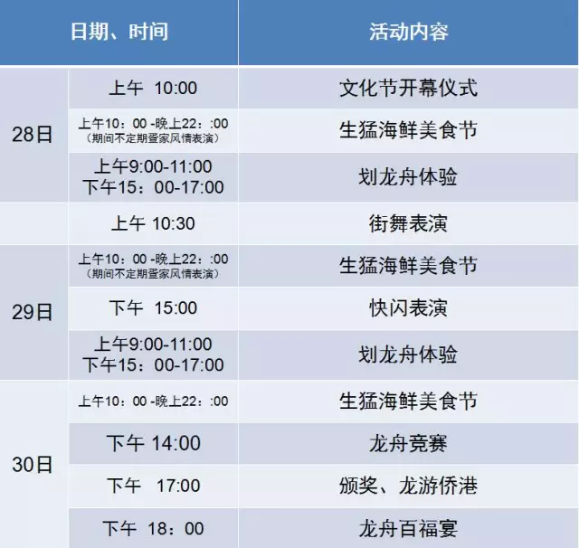 生猛海鮮節(jié)除了可以品嘗海產(chǎn)品等特色美食外,還有疍家特色飾品店、服裝、時尚飲品、北海特產(chǎn)等等。賽龍舟是僑港鎮(zhèn)慶賀端午節(jié)的傳統(tǒng)活動之一,活動當天船員首先用肥豬肉在船底抹油、協(xié)力安裝龍頭,龍舟200米直道往返競賽,還有祭港儀式等,場面熱鬧非凡。龍舟的龍頭在疍家人的心里地位非常重要,寓意平安、吉祥等好意頭。本次活動推出龍舟龍頭展覽,供旅客拍照,同時也舉行龍頭游街祈;顒,游客市民可感受熱鬧的節(jié)日氛圍。這一具有濃郁民俗色彩的群眾性文化活動,每年都吸引不少市民和中外游客前來觀看,今年新增了體驗項目,參加活動的市民游客還可參與體驗賽龍舟等。