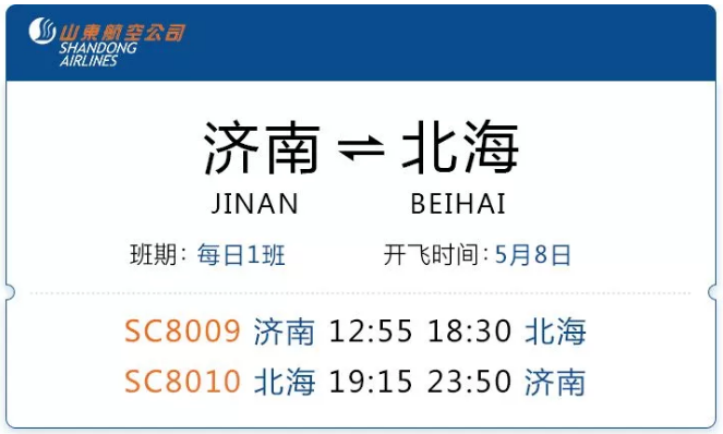 廣西北海旅行社訊 據(jù)了解,新開航線航班分別SC8009、SC8010,機型波音 737-800(中型),航班周期每日一班:12:55濟南起飛,18:30到達北海;19:15由北海返回,23:50到達濟南,中間經(jīng)停溫州。