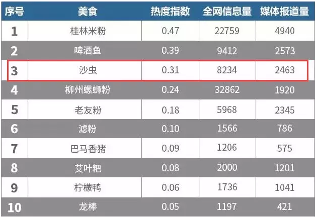 4月,沙蟲(chóng)的熱度指數(shù)0.31,較3月稍有下降,位居榜單第三名。排在前十名的美食不同地域、不同種類(lèi),均代表了廣西本土美食的特色。