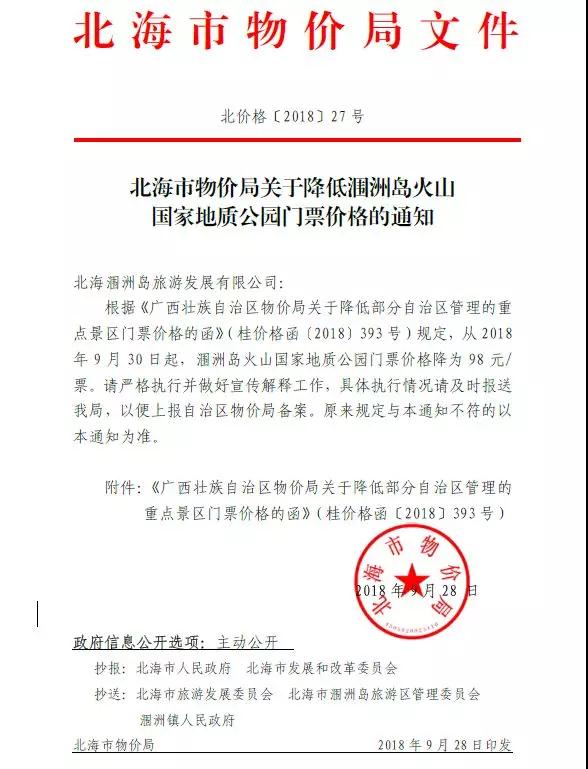 根據(jù)《廣西壯族自治區(qū)物價局關于降低部分自治區(qū)管理的重點景區(qū)門票價格的函》(桂價格函[2018]393號)文件要求,現(xiàn)將潿洲島火山國家地質(zhì)公園門票調(diào)價有關情況通知如下: