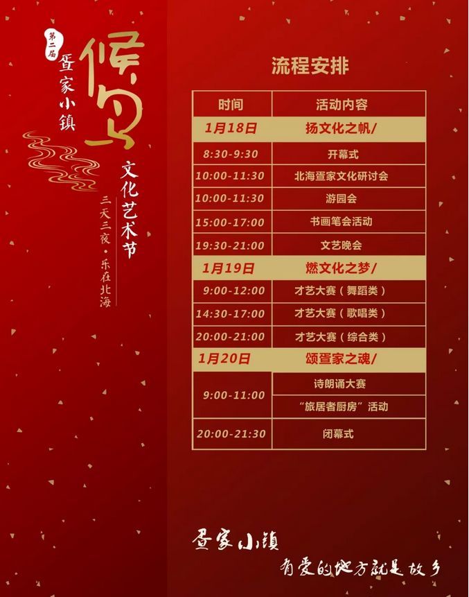 為積極響應(yīng)北海市積極服務(wù)“候鳥”群體發(fā)展“候鳥”經(jīng)濟的指示精神,全力實施全域旅游城市建設(shè)大會戰(zhàn),深入挖掘、傳承、弘揚北海疍家文化精髓,打造疍家小鎮(zhèn)“旅游+文化”品牌,豐富“候鳥”群體的文化生活,不斷增強“候鳥”群體的歸屬感、融合感和幸福感。銀灘疍家小鎮(zhèn)將舉辦第二屆“候鳥”文化藝術(shù)節(jié)。