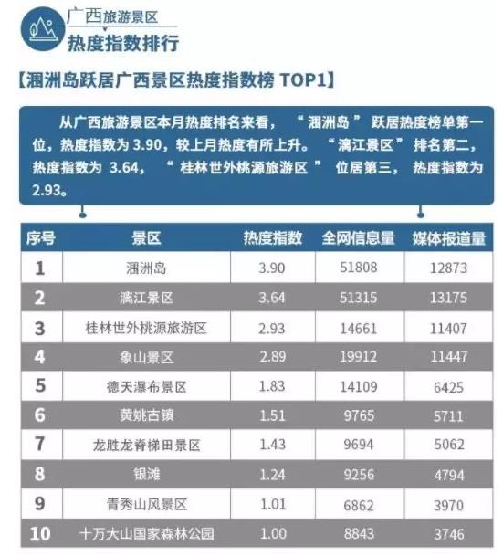廣西旅游行業(yè)數(shù)據(jù)報告及排行中所指網(wǎng)絡(luò)傳播熱度指數(shù),是指在從新聞媒體、微博、微信、客戶端、網(wǎng)站、論壇等互聯(lián)網(wǎng)平臺采集海量信息的基礎(chǔ)上,提取指定事件、人物、品牌、地域等相關(guān)信息,并對所提取的信息進(jìn)行標(biāo)準(zhǔn)化計算后,得出的能反映其在網(wǎng)絡(luò)上受關(guān)注度的指數(shù);熱度值所呈現(xiàn)的數(shù)值為0-100,數(shù)值越大,表明其網(wǎng)絡(luò)受關(guān)注度越高。