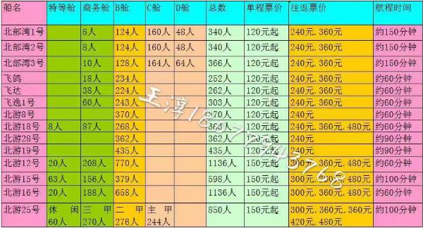 飛達(dá),飛逸1號(hào),北游18:A等艙(位于二樓)180元/人,B等艙(位于一樓)120/人,特等艙240元/人