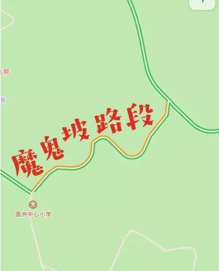 這條路因地勢兇險而出名,島民都把它叫做“魔鬼坡”。(地圖上黃色和綠色的雙線就是“魔鬼坡路段”,這個路段東高西低,坡下就是潿洲中心小學。)