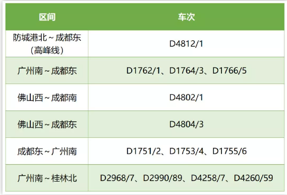借助新線運(yùn)能釋放,新圖經(jīng)由貴廣客專廣西境內(nèi)的動(dòng)車組新增13對(duì),其中開往成都方向的動(dòng)車組9對(duì),利用跨局套跑動(dòng)車組在桂林至廣州兩地間新增D2968/2967、D2990/2989、D4258/4257、D4260/42594對(duì)動(dòng)車組列車。亮點(diǎn)二:調(diào)整運(yùn)行區(qū)段9對(duì),