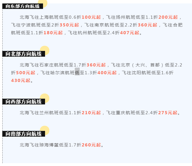 近來,在北海機場投入運力的航空公司結(jié)合冬季"候鳥”人群探親訪友往來密切的特點,紛紛推出了航空出行優(yōu)惠票價,特別為北海市民元旦假日出行加大了優(yōu)惠力度,讓機票價格更親民!南方航空、春秋航空、國際航空、吉祥航空等多家航空公司為回饋廣大市民,方便市民旅游、探親和返家,截止至12月末部分航線在年末放出今年以來最優(yōu)惠票價。(以下機票價格均不含民航發(fā)展基金稅)北海機場溫馨提醒